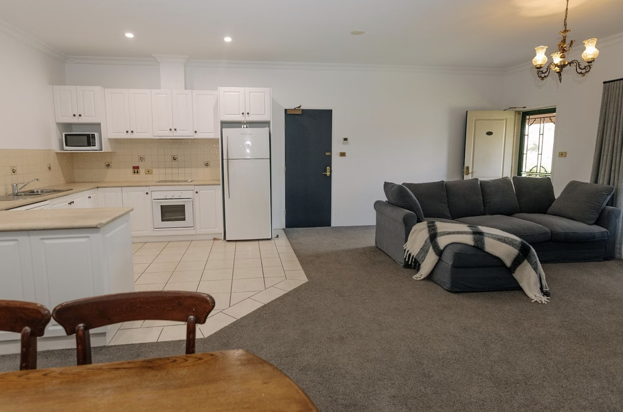 A spacious and fully self-contained option, perfect for families, groups, or extended stays. This well-appointed apartment features two separate bedrooms for privacy and relaxation, with a single shared bathroom. The main bedroom includes a queen bed, while the second bedroom has a single bed. The open living area features a comfortable fold-out couch and a flat-screen TV with streaming services. The fully equipped kitchen includes a stove, oven, microwave, and full-sized fridge, making it easy to prepare meals.